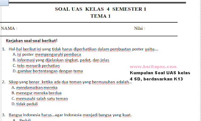 Uas kelas 4 soal per tema (klik disini).